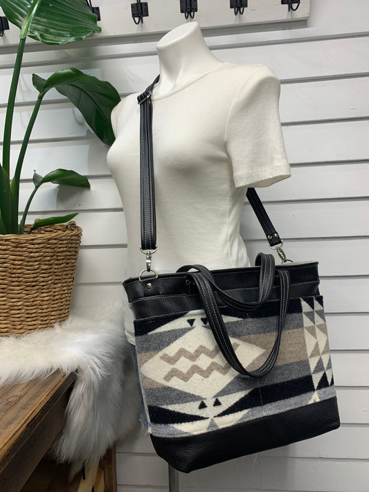 Topaz tote Wool and leather, Pueblo Dwelling, black pebble grain leather
