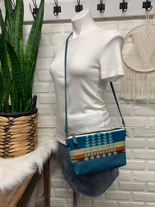 Ruby crossbody bag wool and leather, teal pebble grain leather top