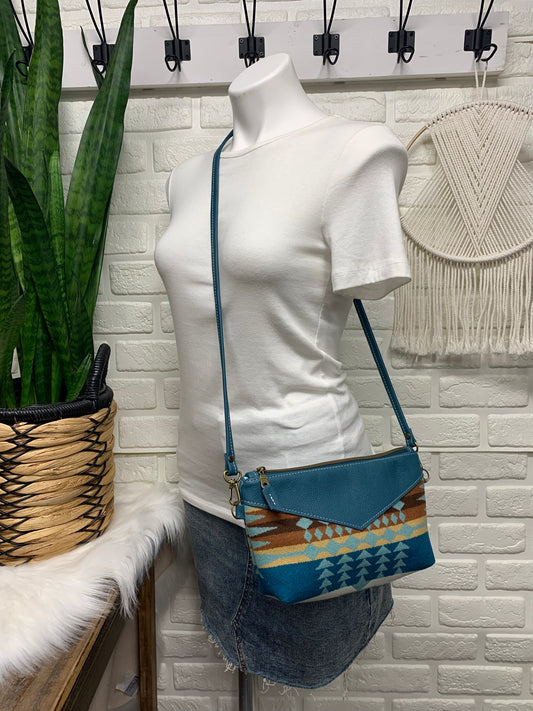 Emerald crossbody bag, Rancho Arroyo aqua wool, caramel genuine leather, Camera bag