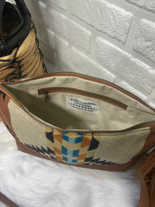 XL Ruby crossbody bag, Rancho Arroyo Aqua wool, caramel brown genuine leather