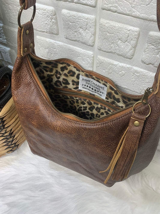 Saddle brown leather crossbody hobo bag, canvas lining, zipper closure, handmade, genuine leather