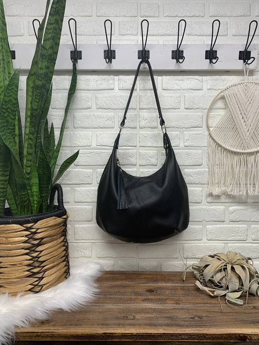 Black leather hobo bag, canvas lining, zipper closure, handmade, genuine leather