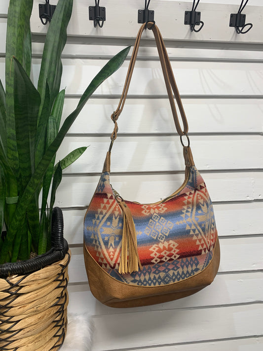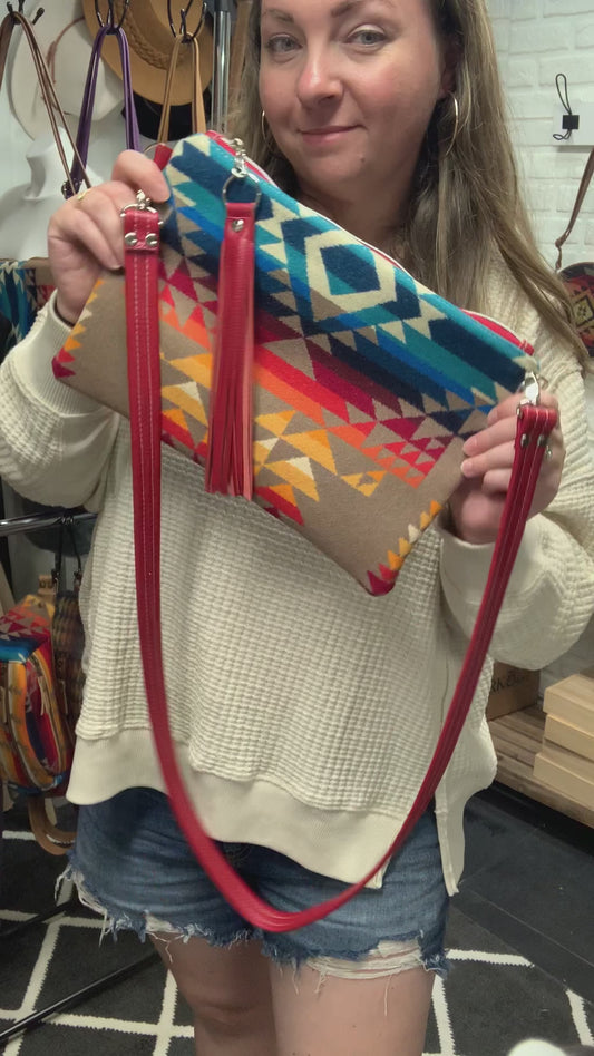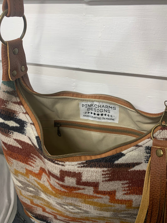 Emerald crossbody bag, Pueblo Dwelling wool, saddle brown leather