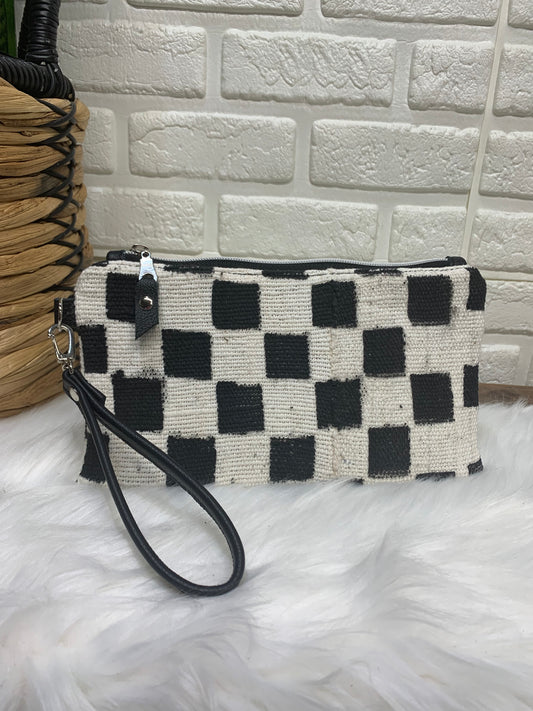 Checkered Mud cloth and black Leather clutch wristlet