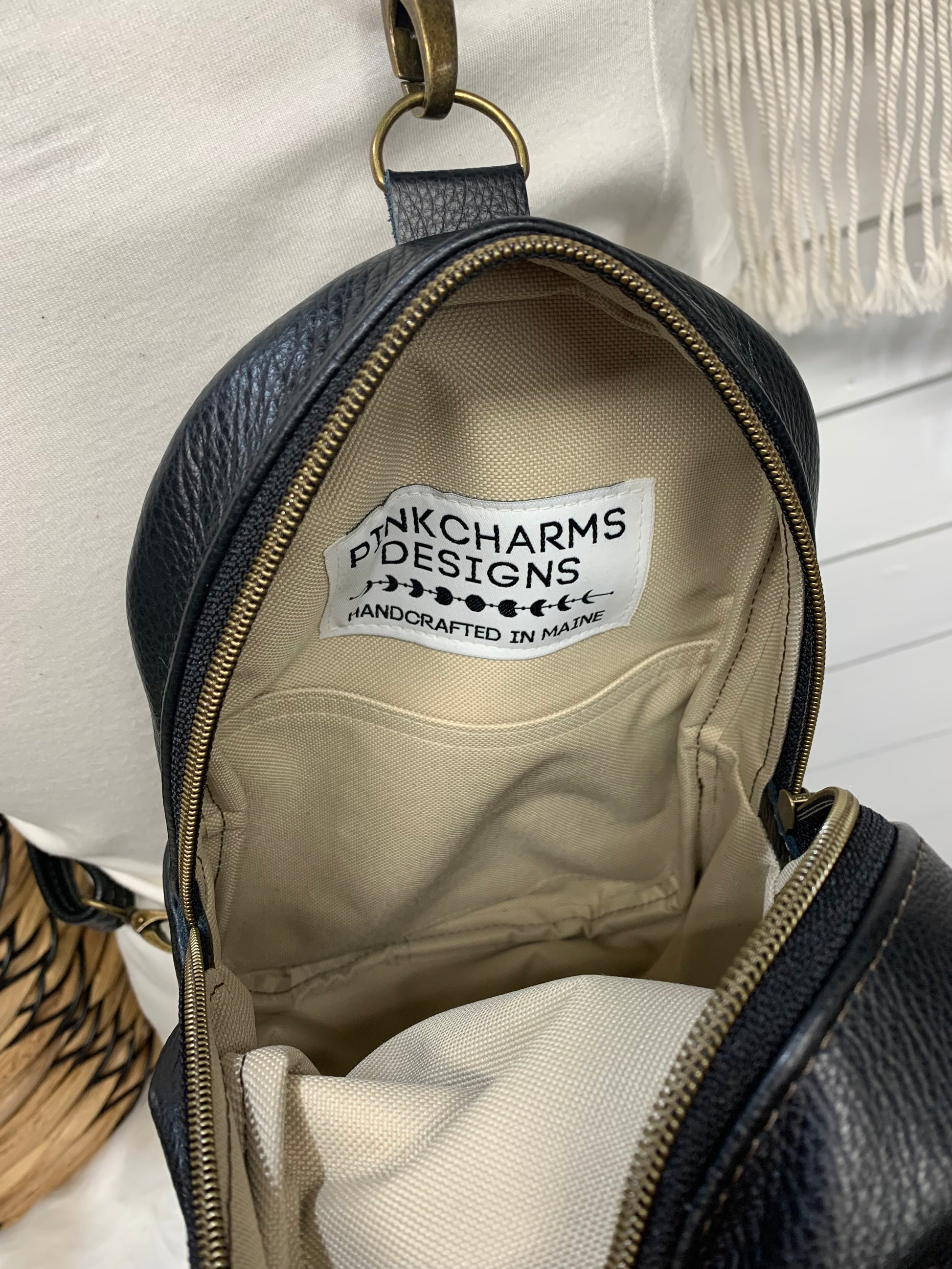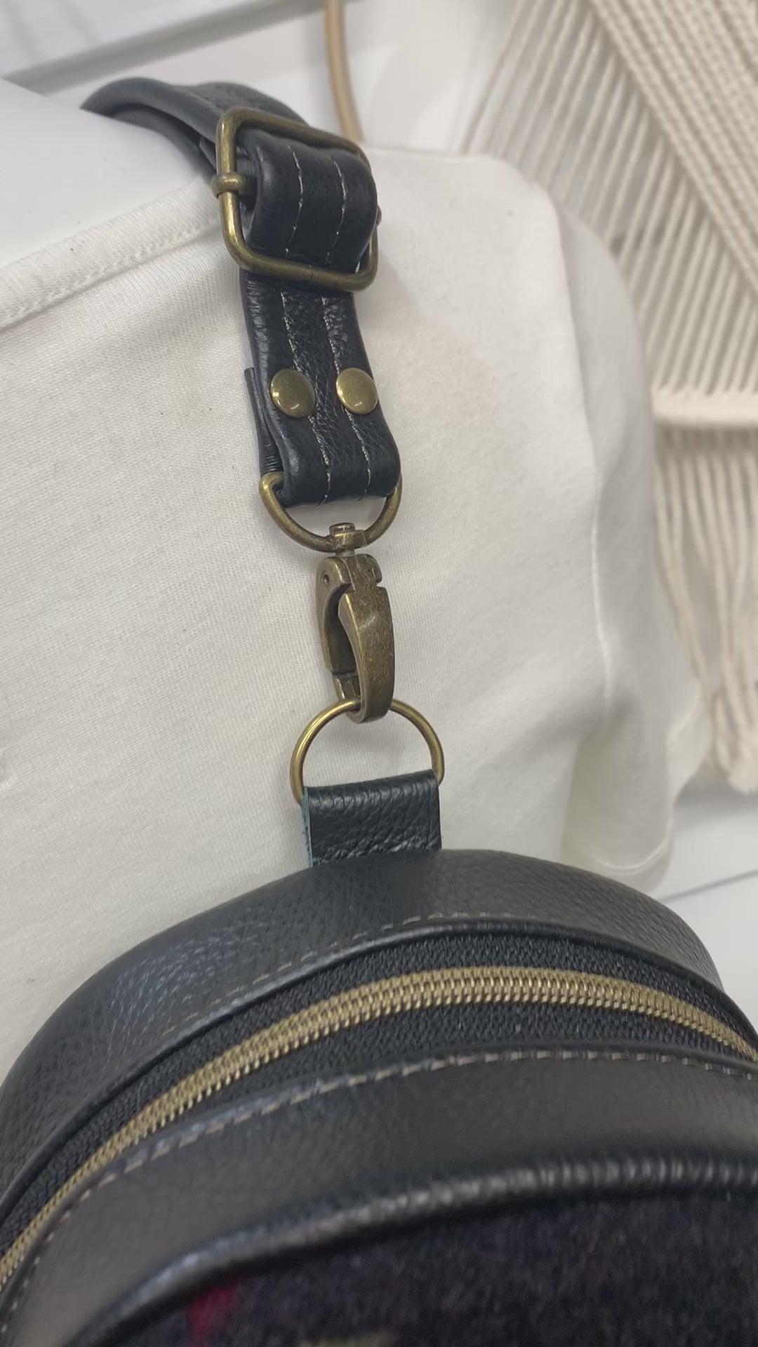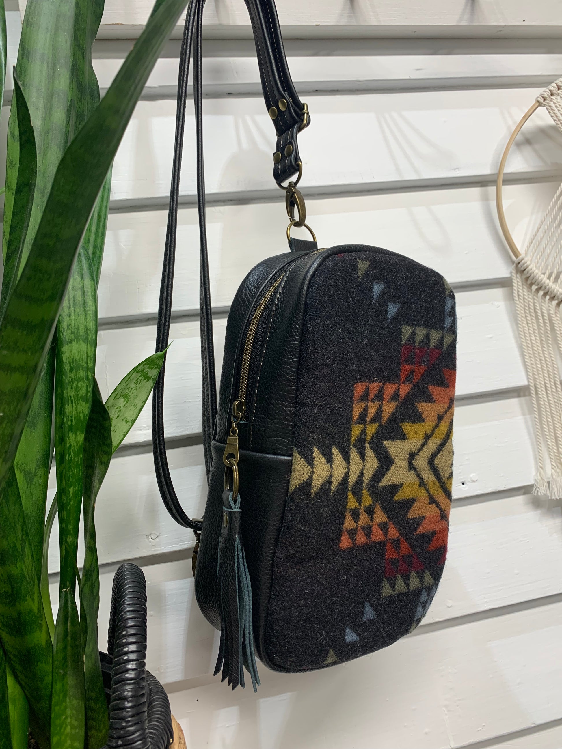 Citrine Sling backpack Pueblo dwelling wool and Black leather