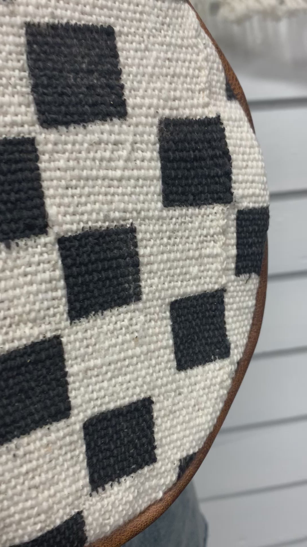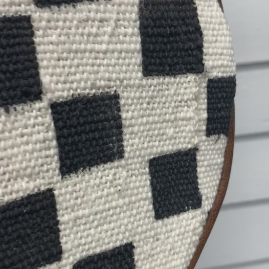 Moonstone crossbody bag, Checkered Mud cloth, saddle brown leather