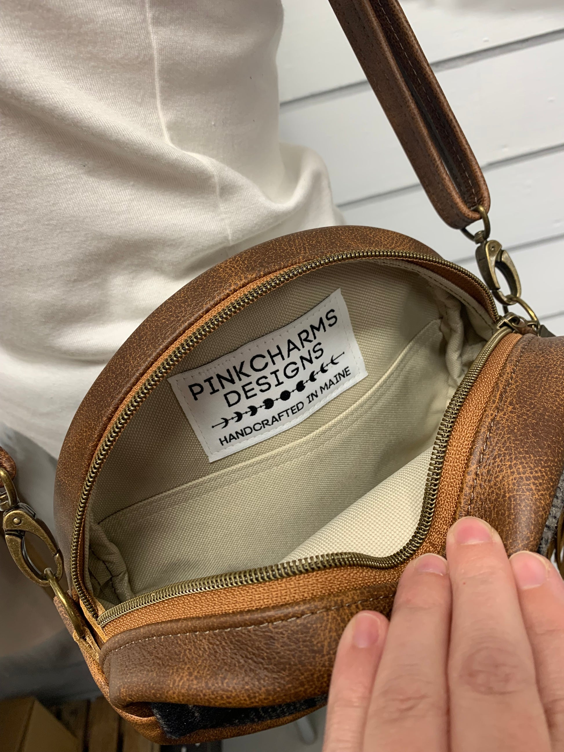 Moonstone crossbody bag, Harding black wool, saddle brown leather, Canteen bag