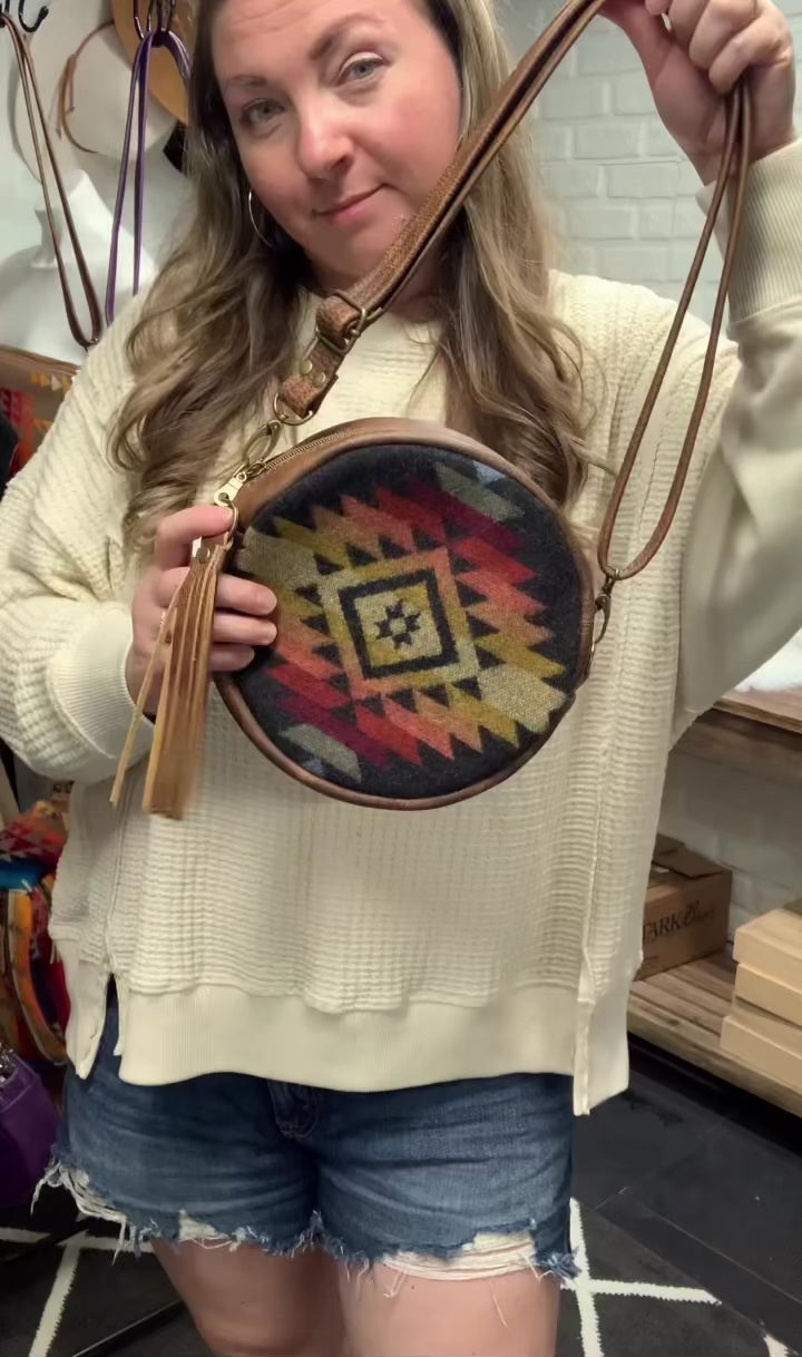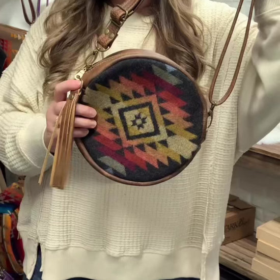 Moonstone crossbody bag, Pueblo dwelling wool, brown leather, Canteen bag